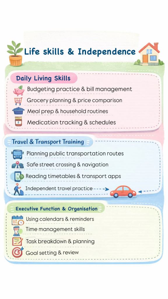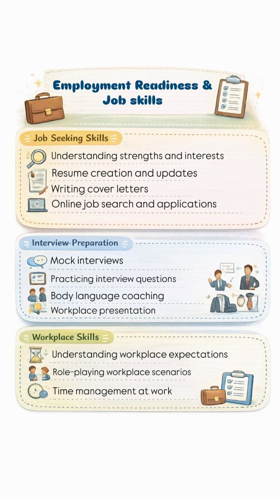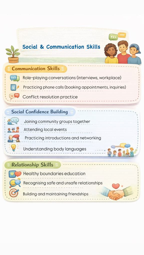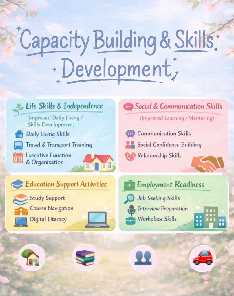 💬 Capacity Building & Skills Development – Support to build life skills and independence such as cooking, social communication, education and employment.
