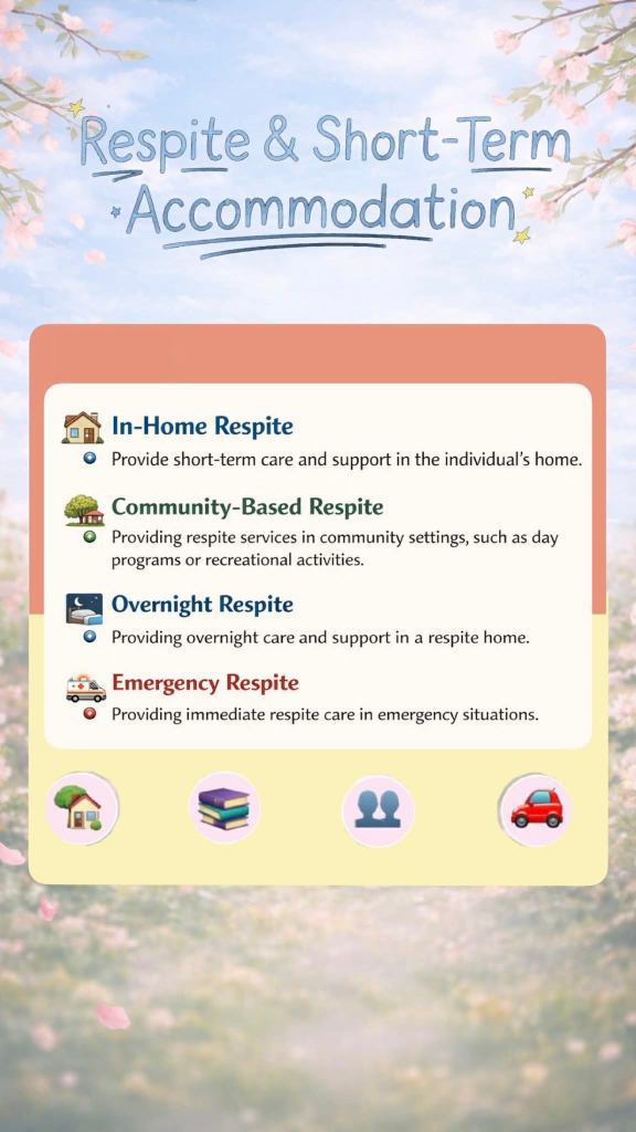 🛏️ Respite & Short Term Accommodation – Short-term support that provides participants with a safe environment while giving carers a break.