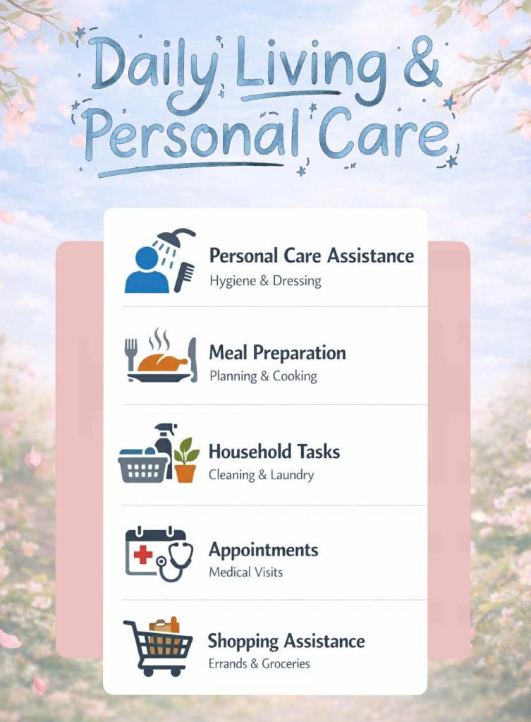 🏠 Daily Living &Personal Care – Assistance with daily living tasks to help participants live as independently as possible.